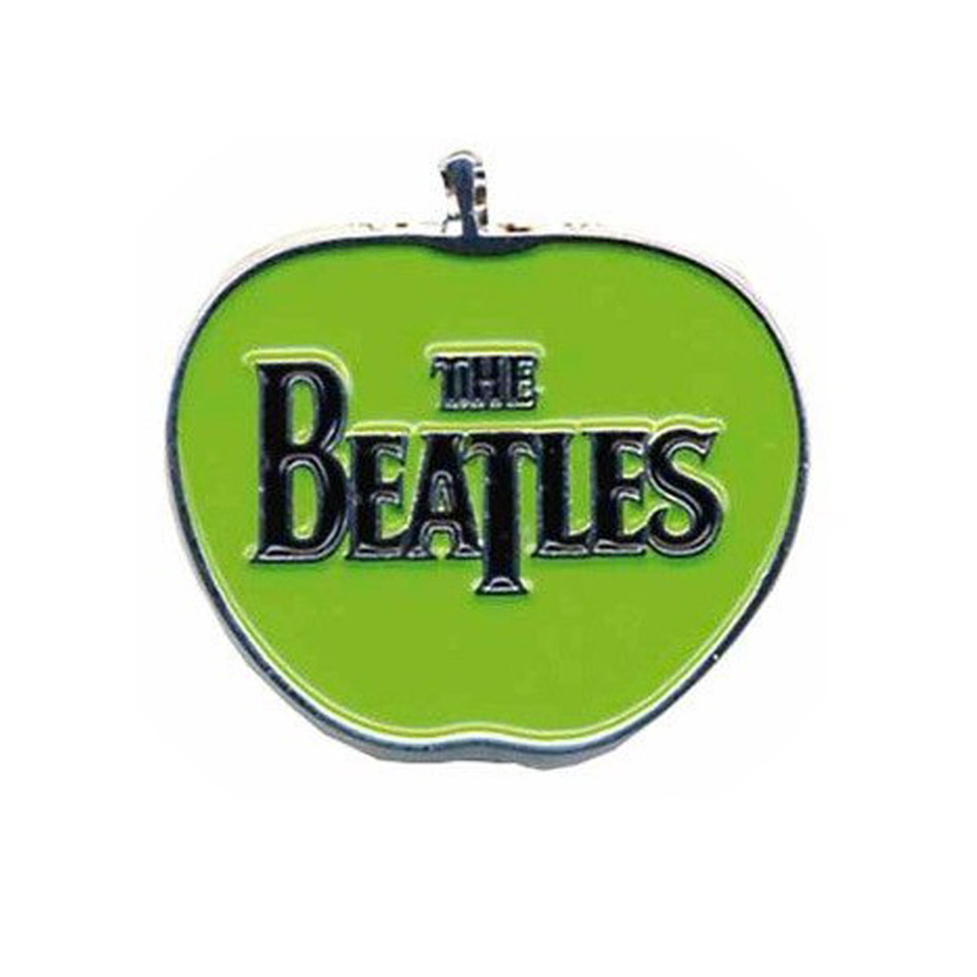 Traditional Beatles logo on the Apple Records, green apple logo. The pin is made of metal and has a covering clip to hold it in place on the other side of a material.