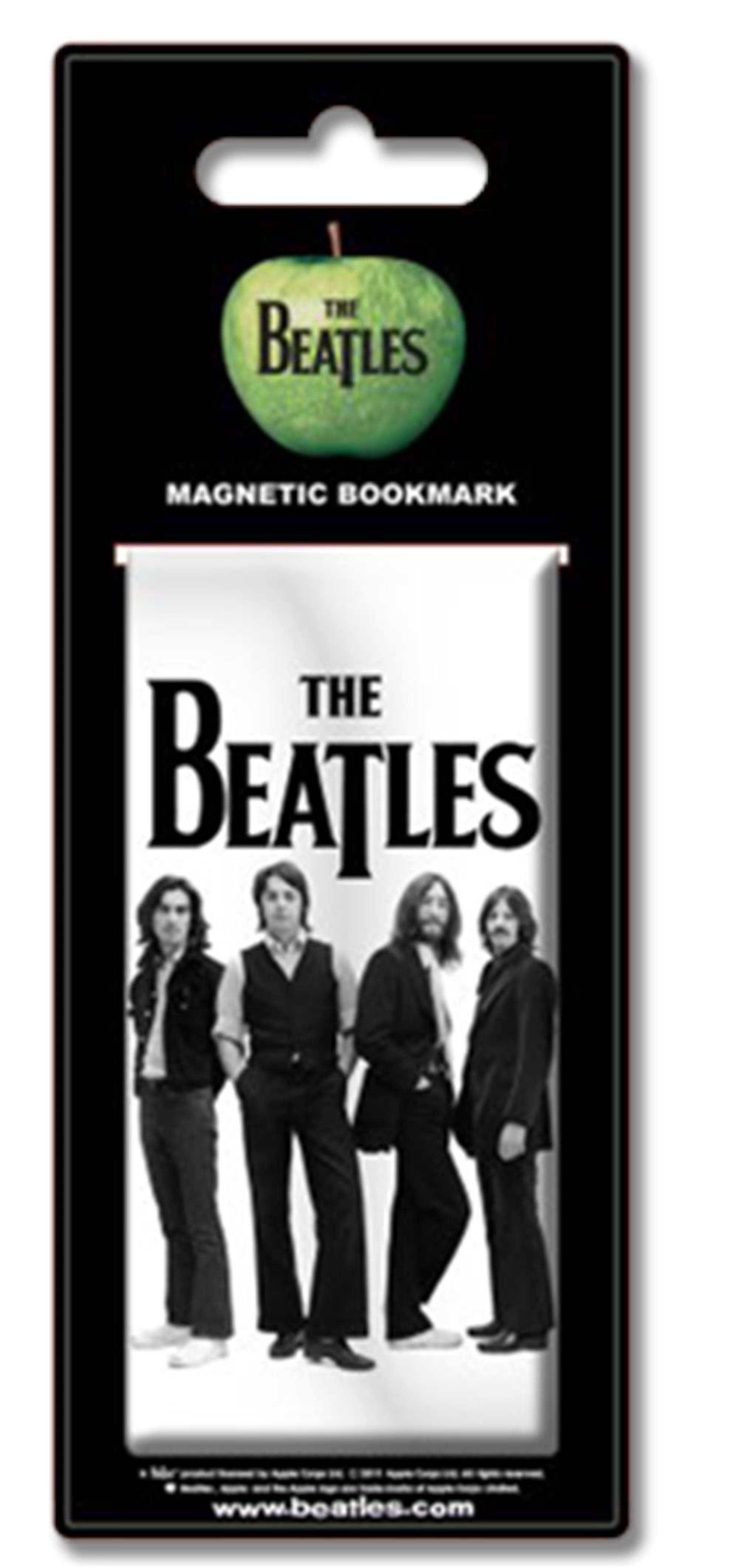 Magnetic bookmark with the Beatles logo inside an apple, above black and white image of the band members.