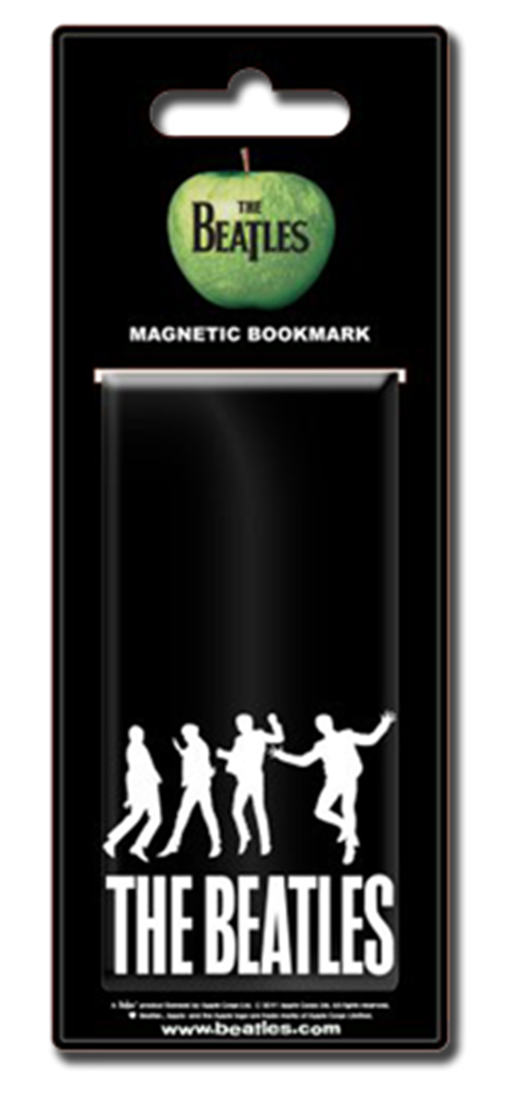 Magnetic bookmark with the Beatles logo inside an apple above black and white image of the band members jumping.
