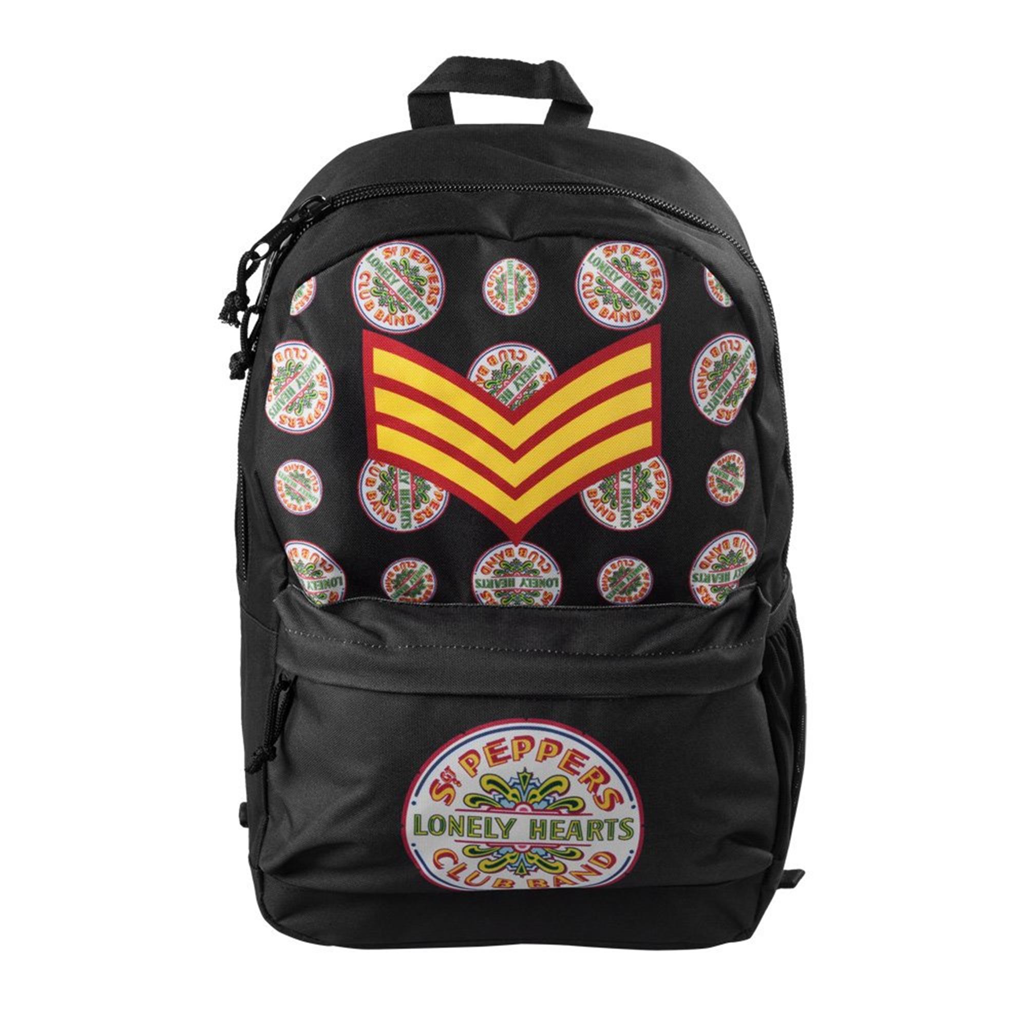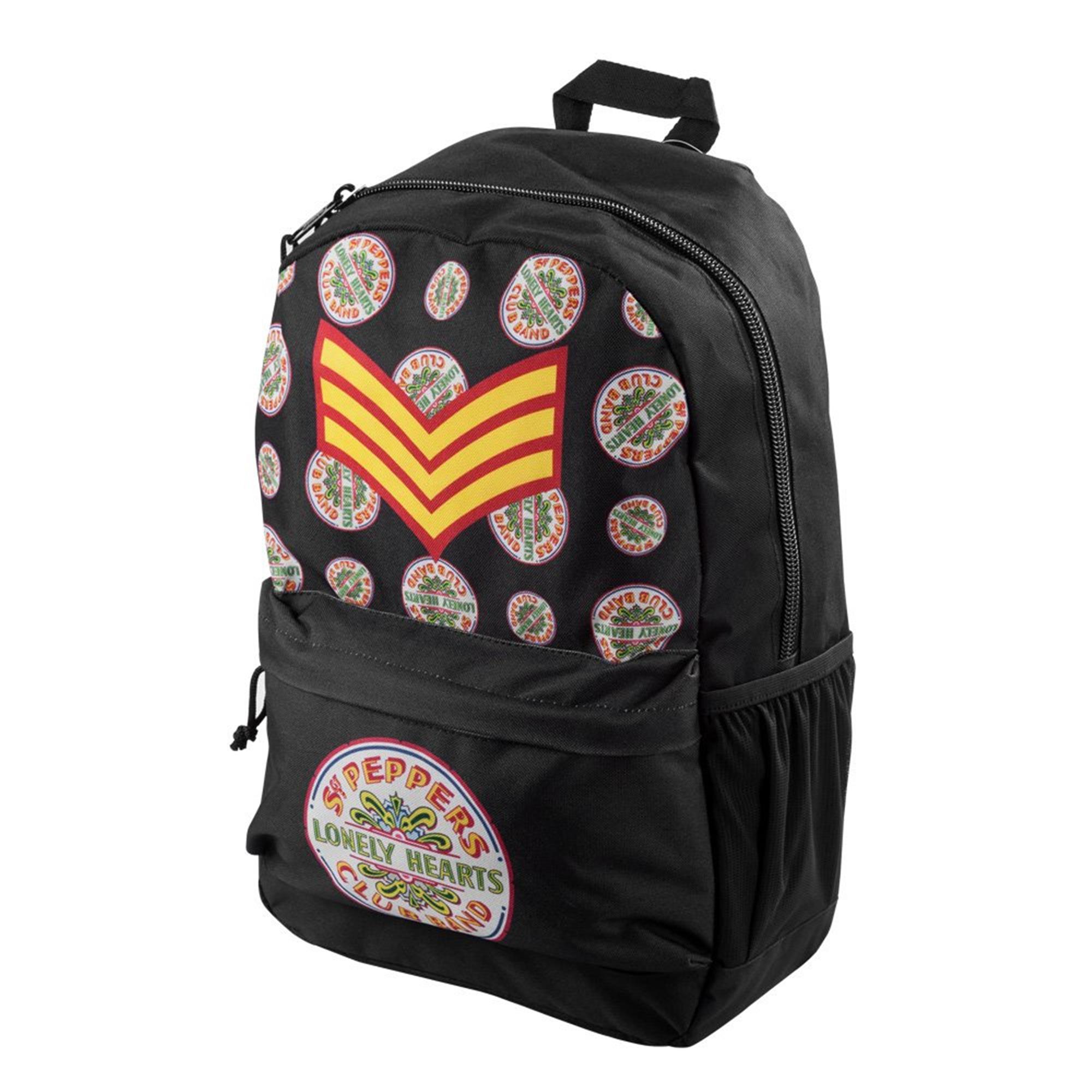 This wicked backpack features artwork from the most groovy Beatles album, 1967's St Peppers Lonely Hearts Club. Crafted with resistant polyester fabric and lining. With a spacious front pocket, an internal divider, and adjustable padded straps.