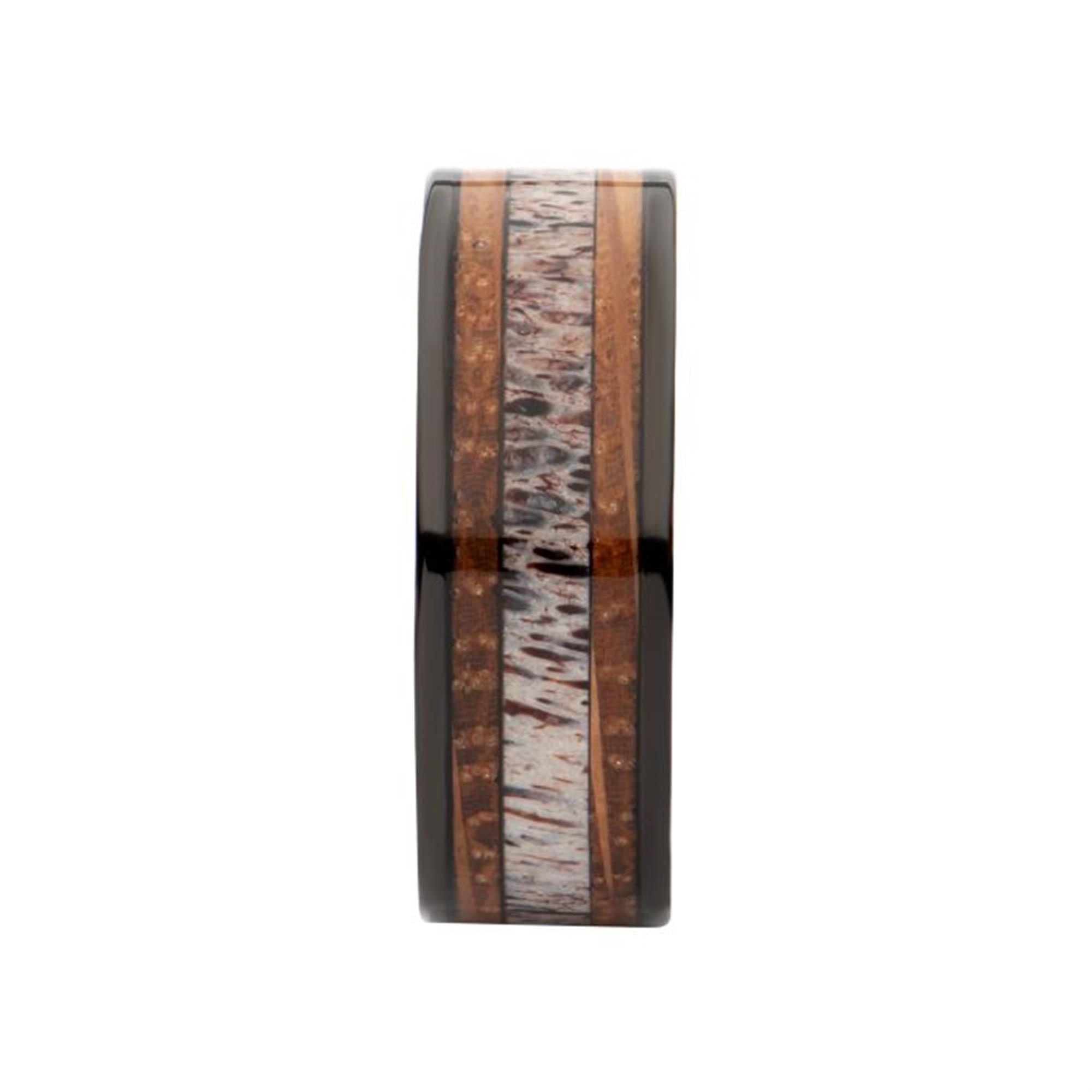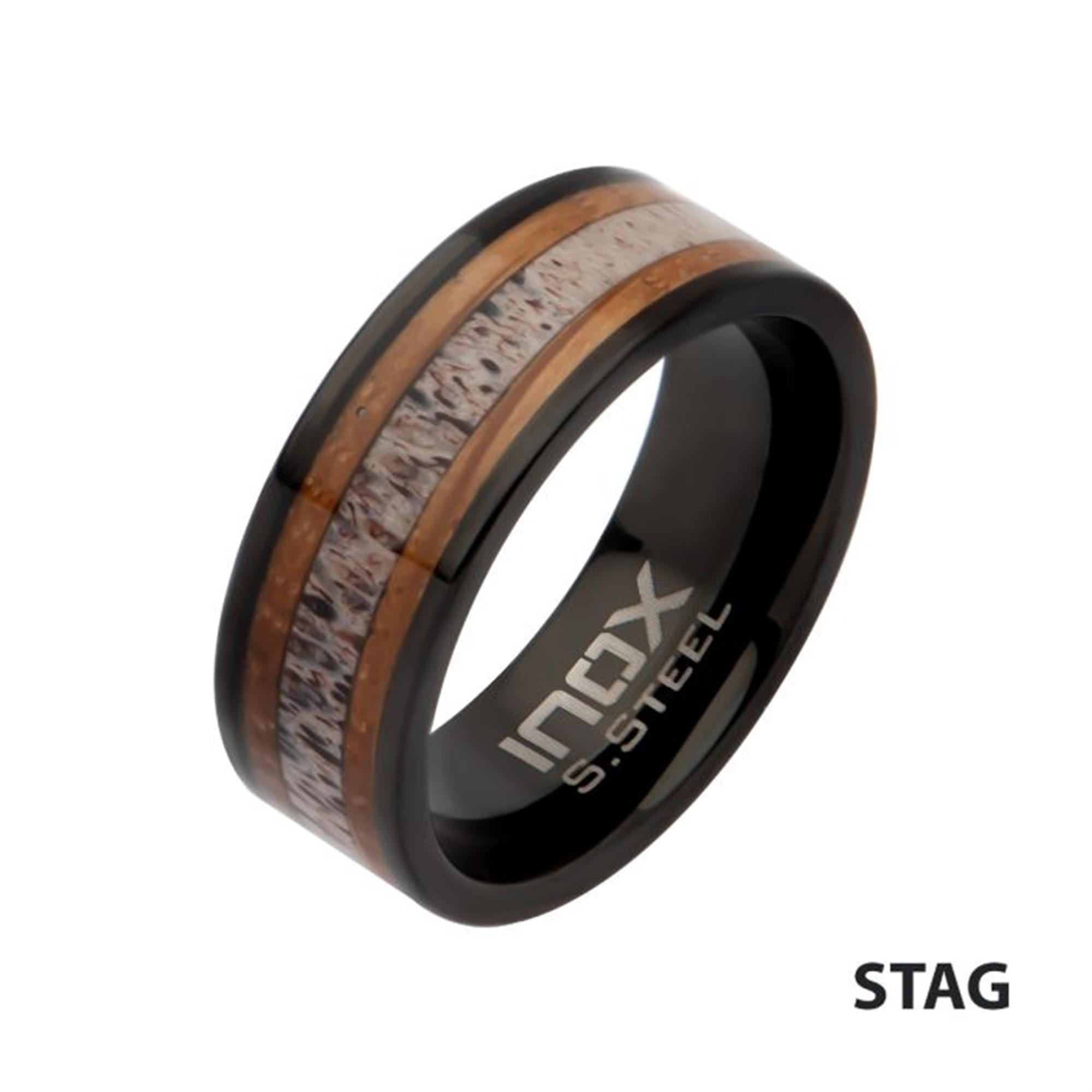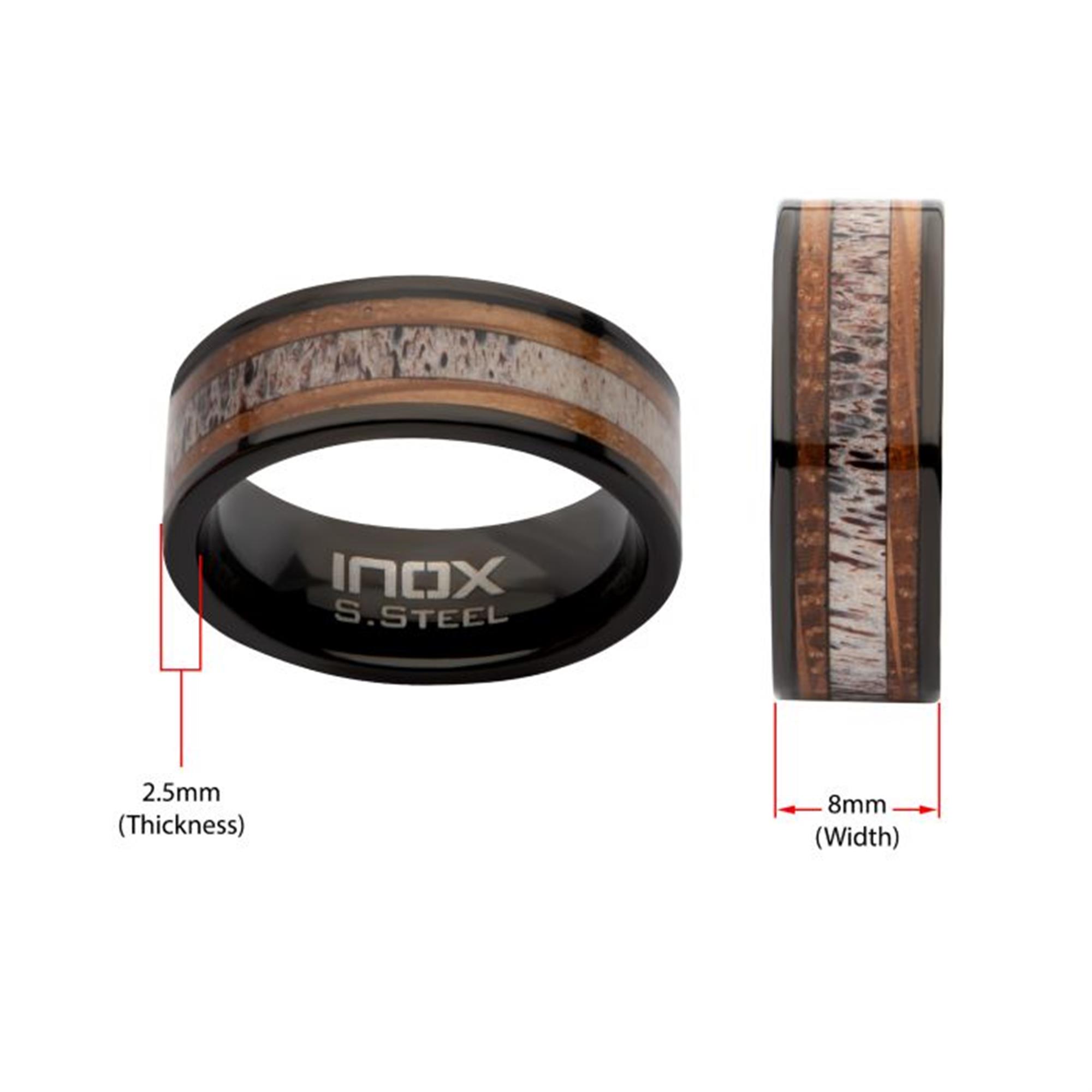 Black IP Stainless Steel Deer Antler Sapele Wood Inlay Stag Comfort Fit Ring