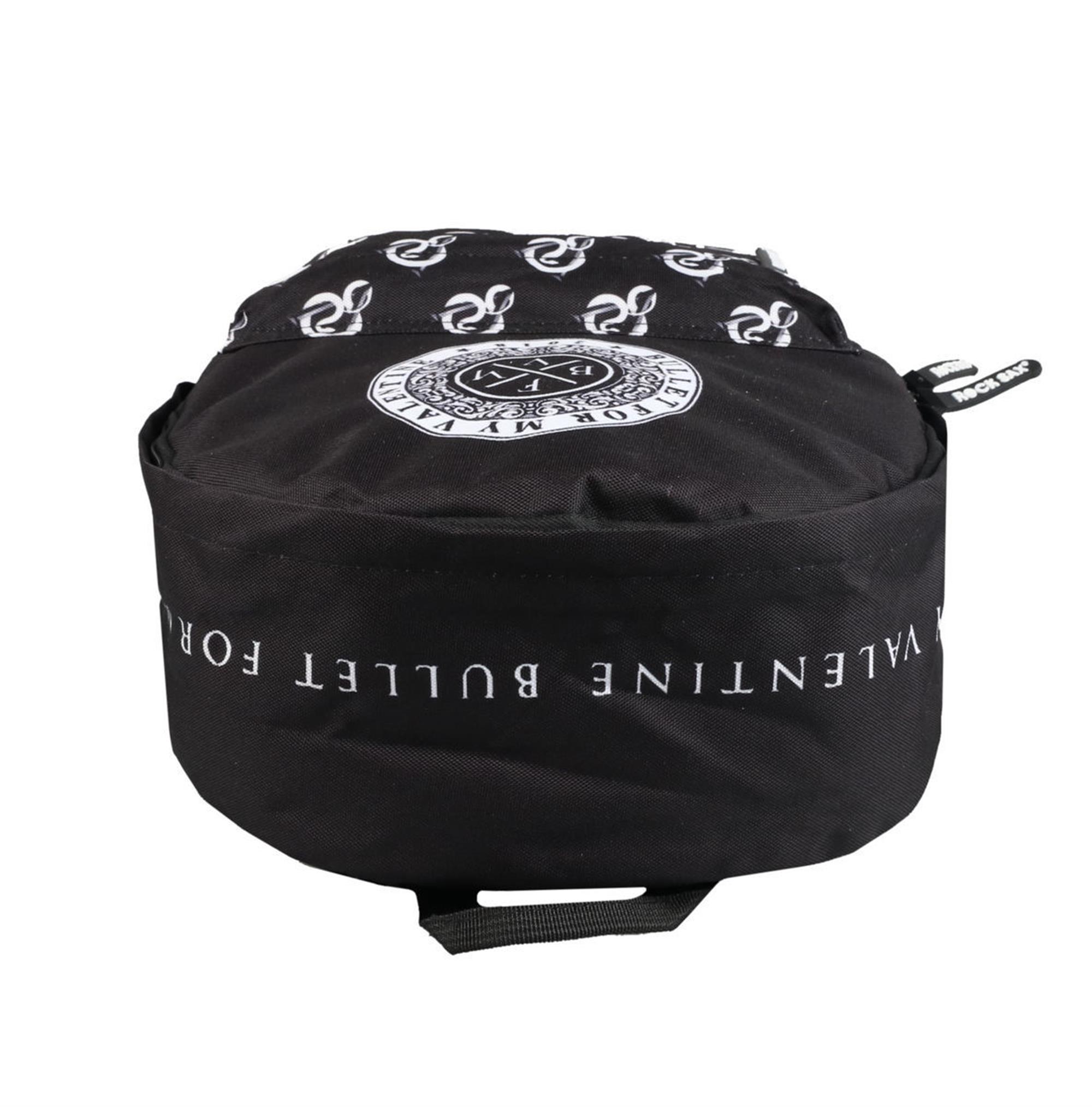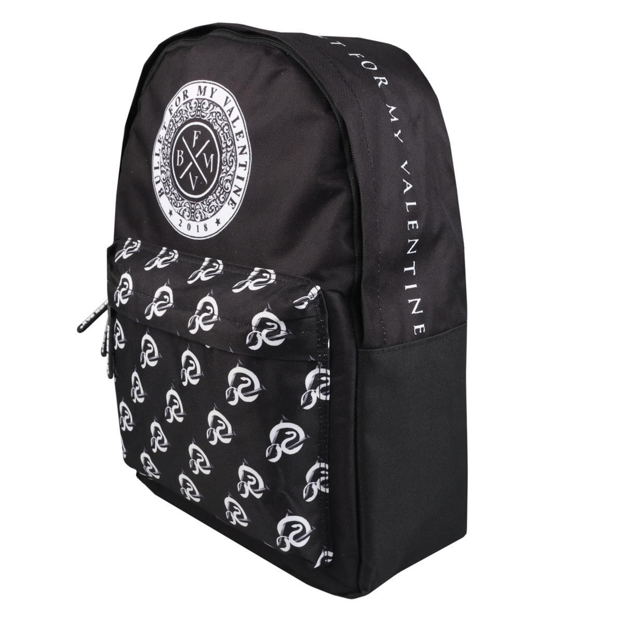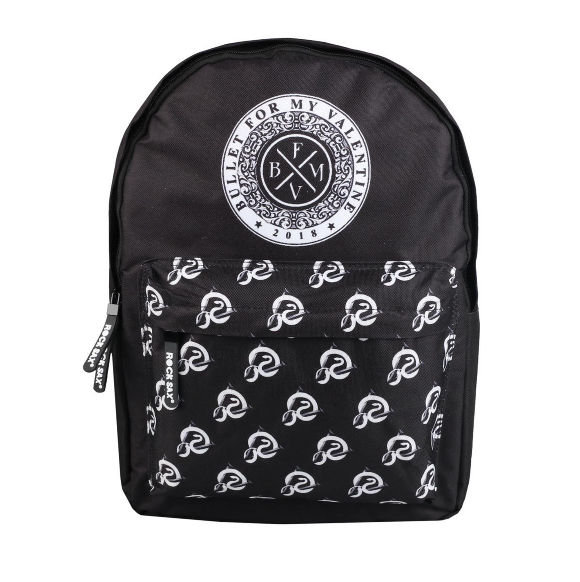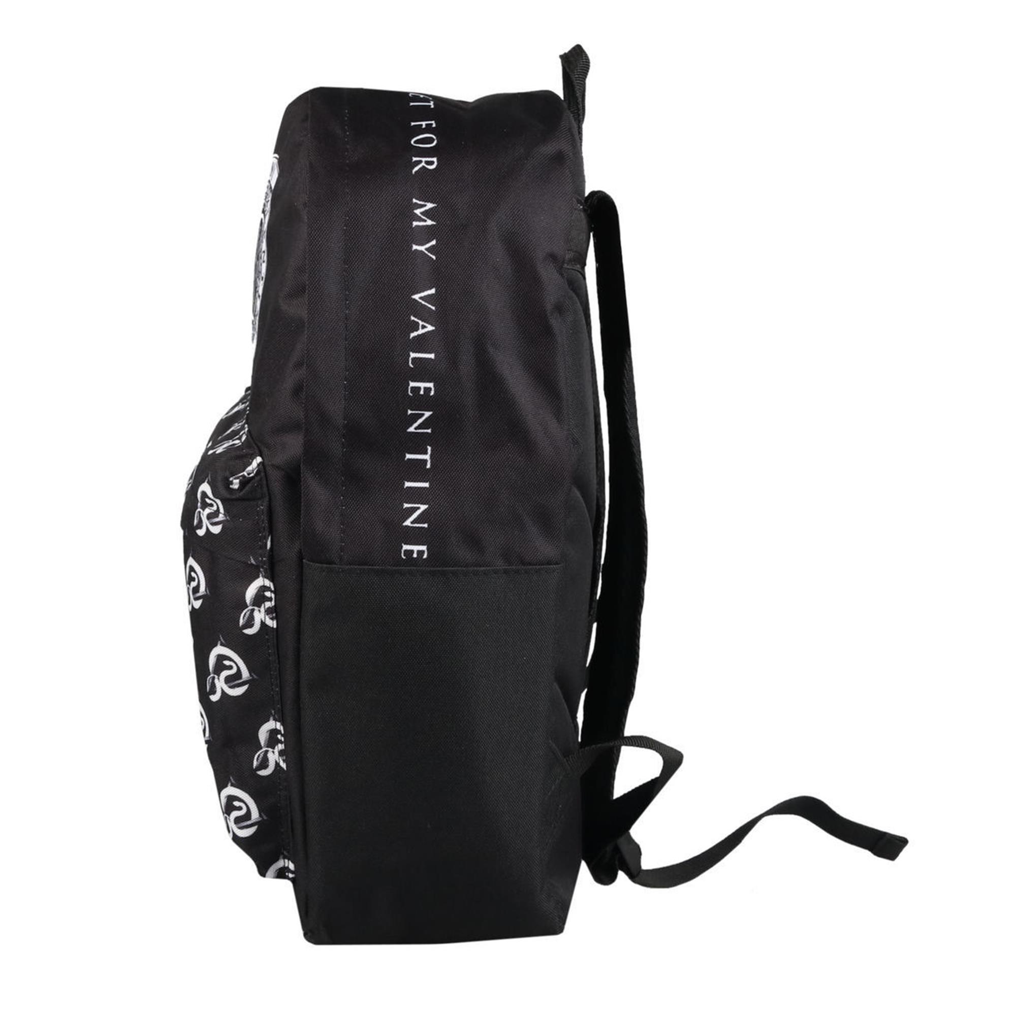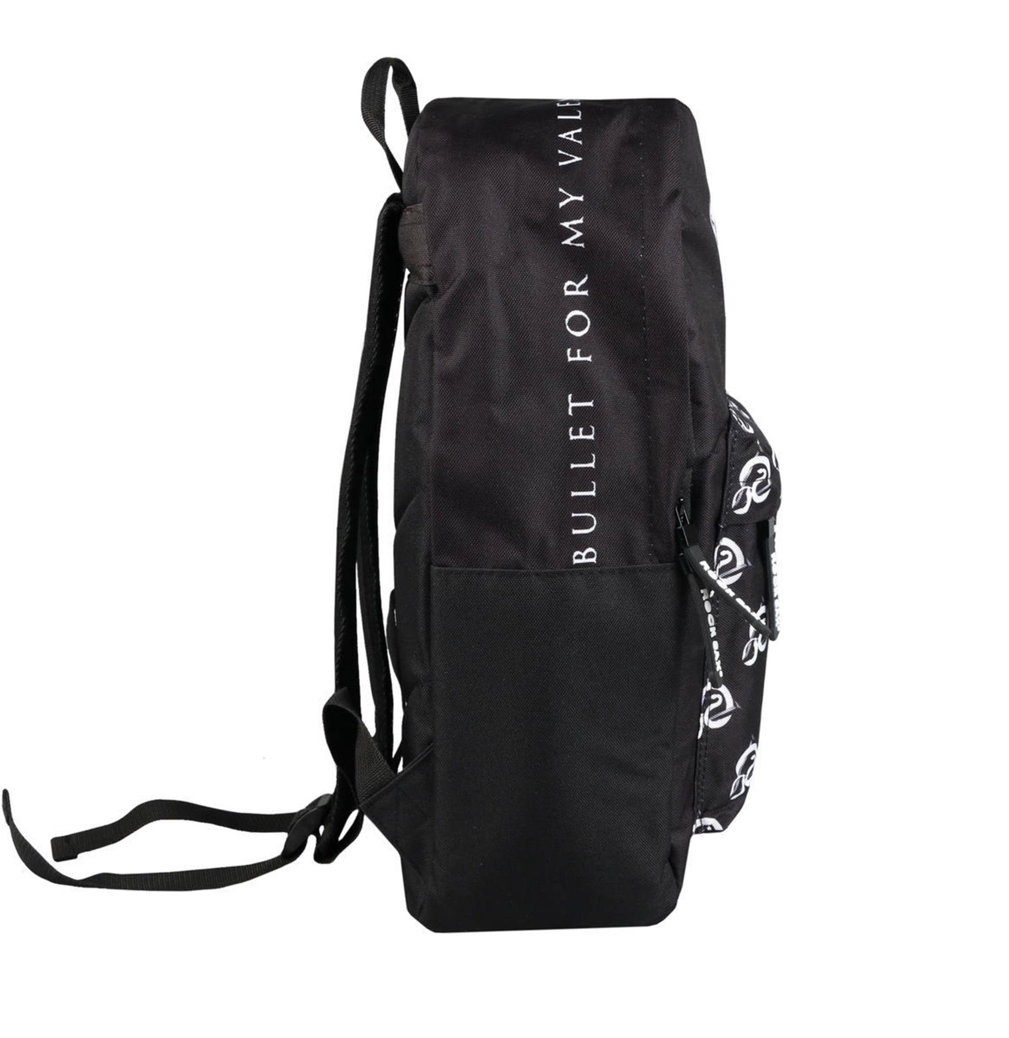 This wicked Bullet For My Valentine backpack with the Gravity album logo. Crafted with resistant polyester fabric and lining. Spacious front pocket, an internal divider, an external media/headphones port, and adjustable padded straps.