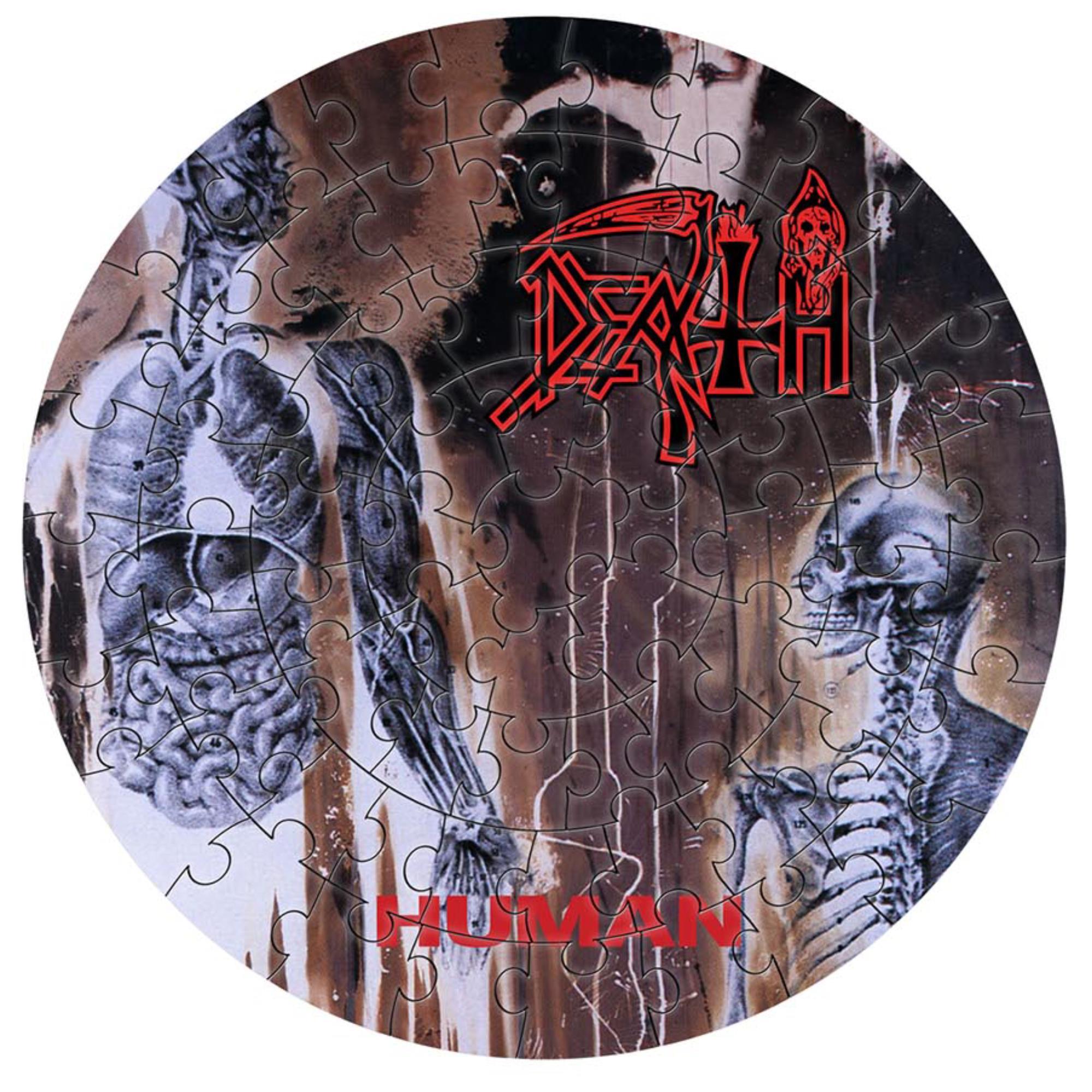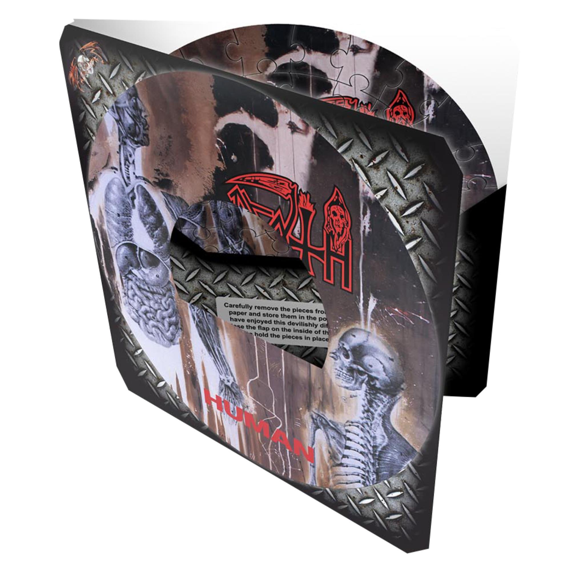 72 pieces officially licensed jigsaw puzzle, shaped like a 7" vinyl record, and comes with reusable packaging. Featuring the cover from Death's fourth studio album, Human, released in 1991.