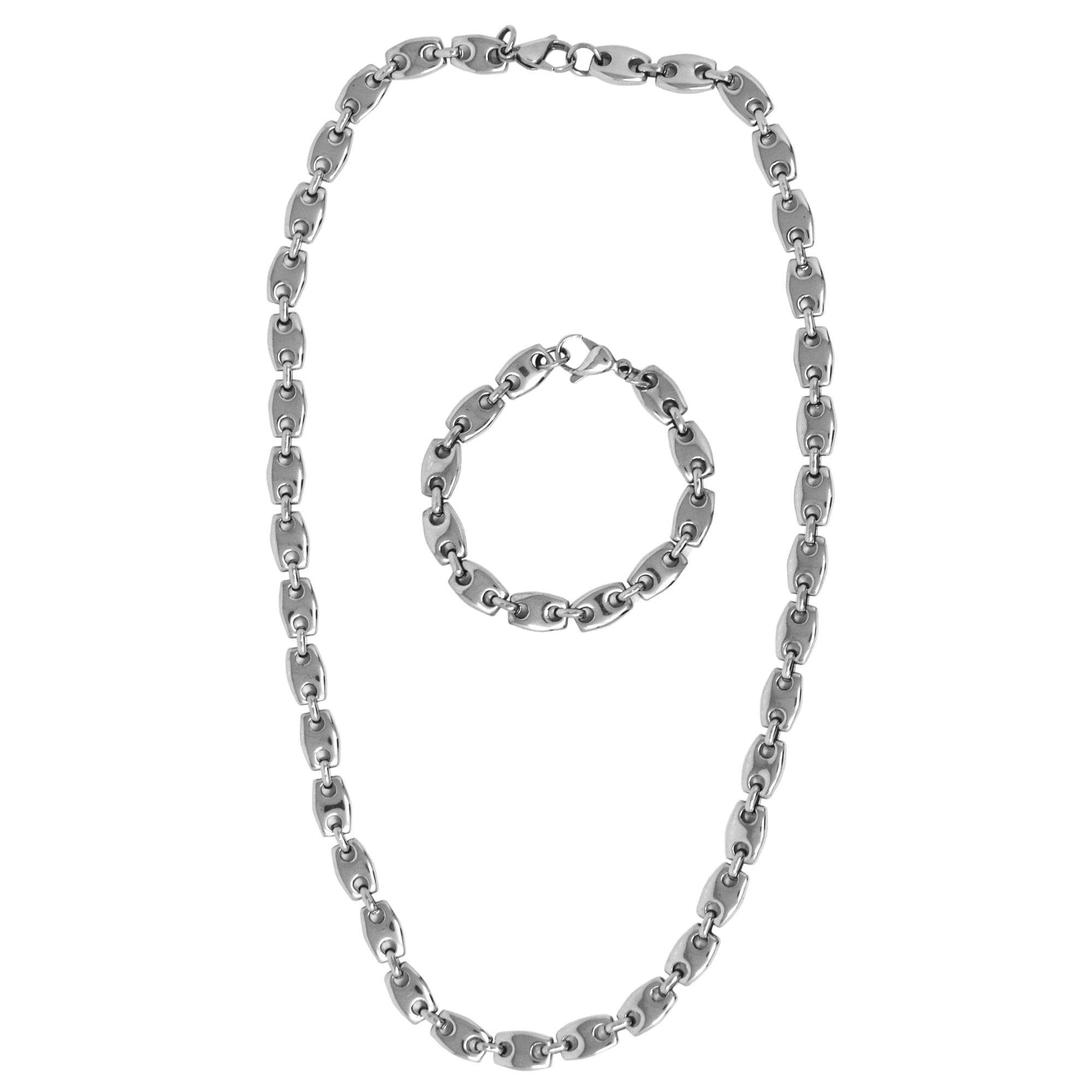 This stainless steel necklace and bracelet set features a flat bead design and lobster claw closure.