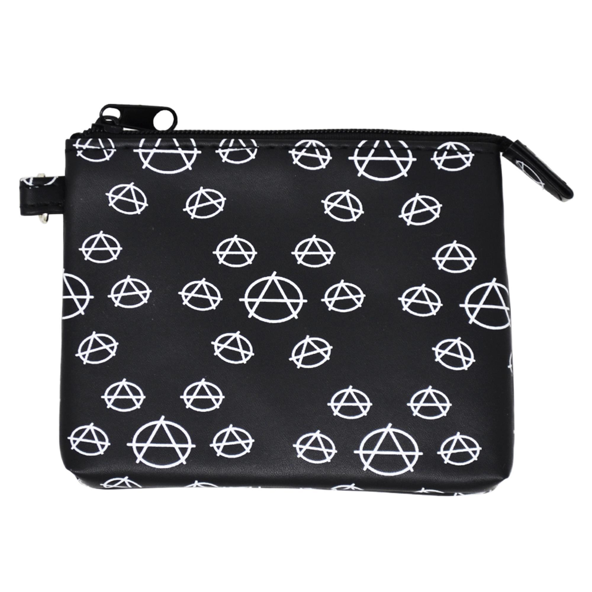 This wicked zip close wallet features a white anarchy print.