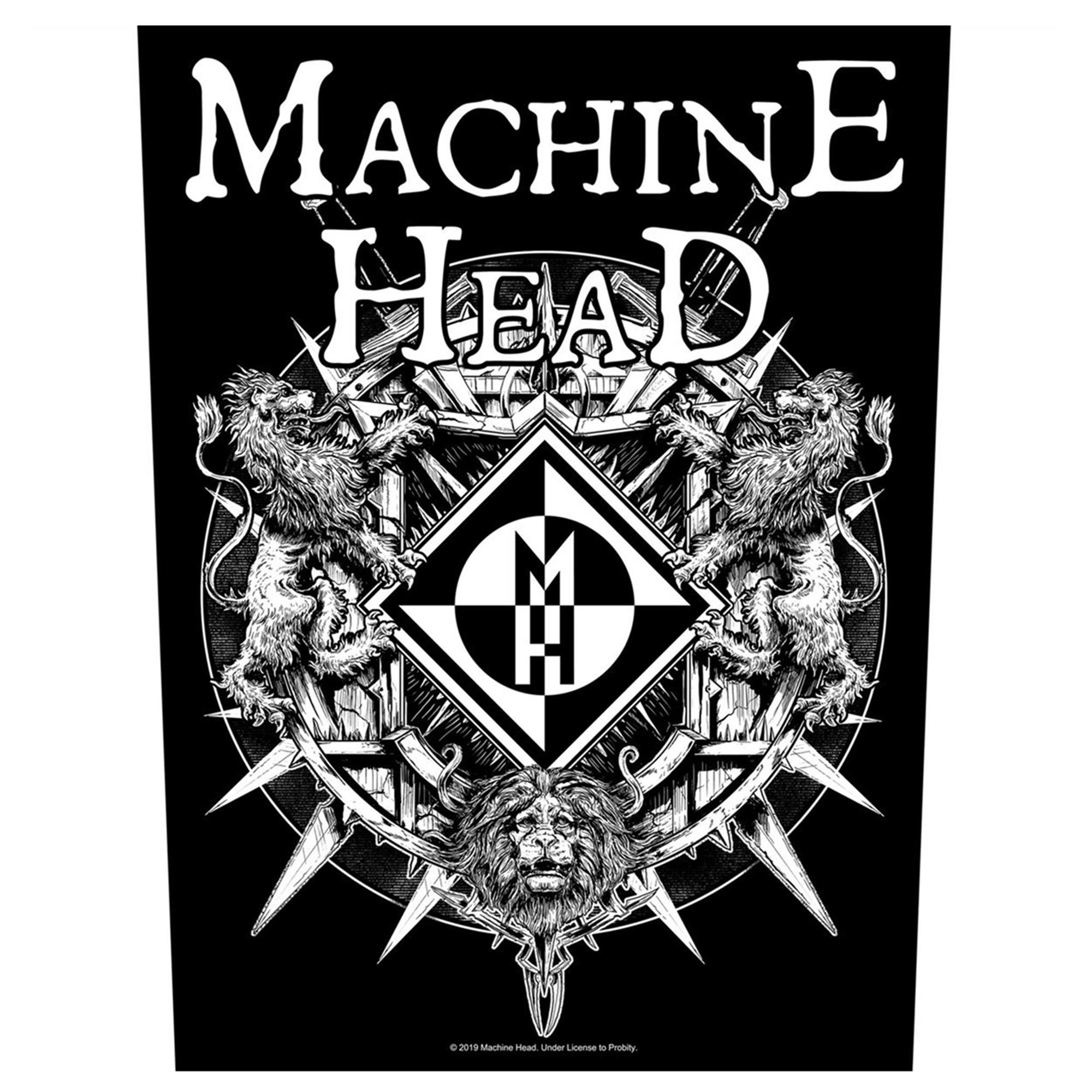 This Machine Head back patch has a medieval spirit. The MH logo is clutched between roaring lions and piercing swords.