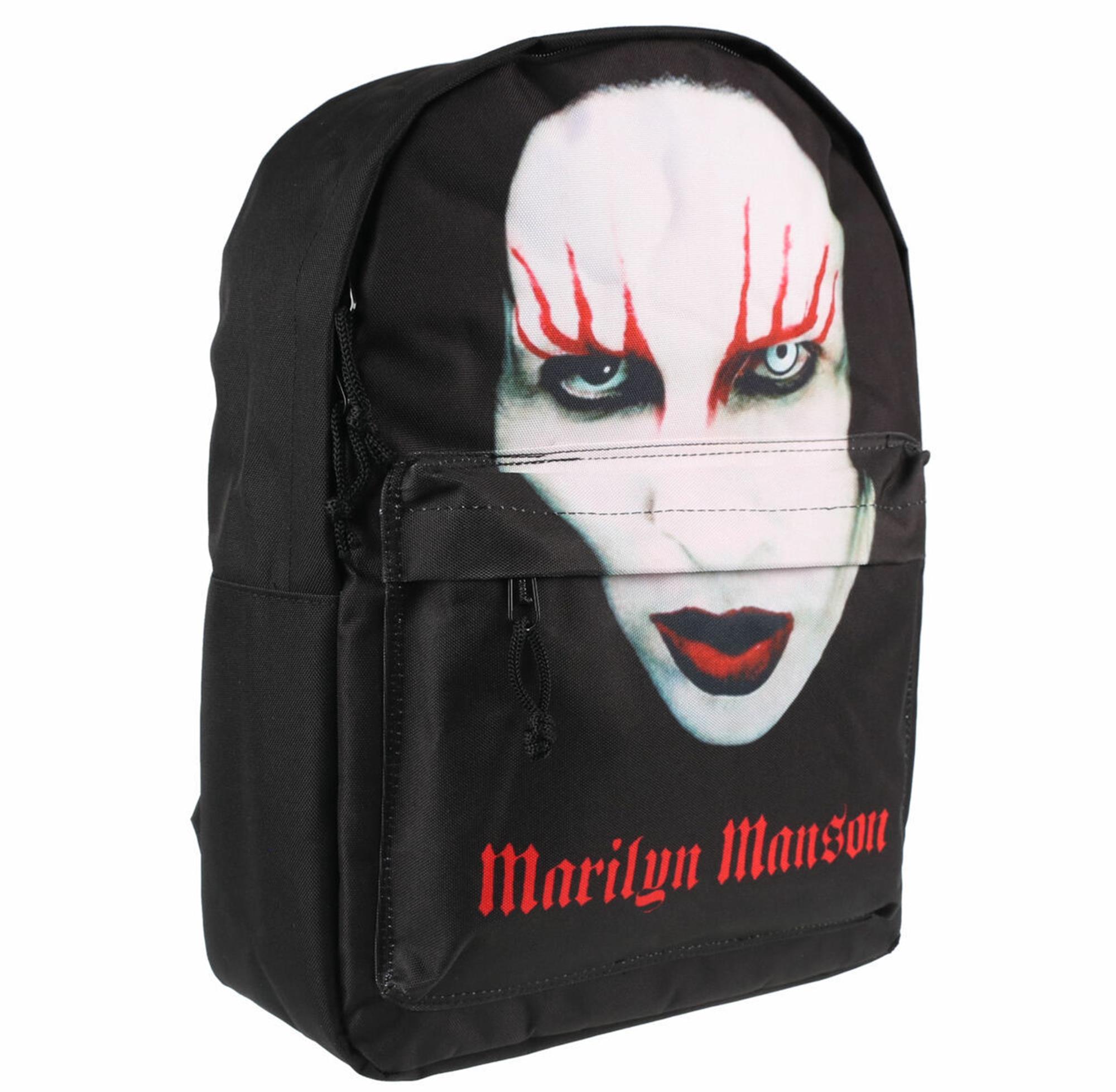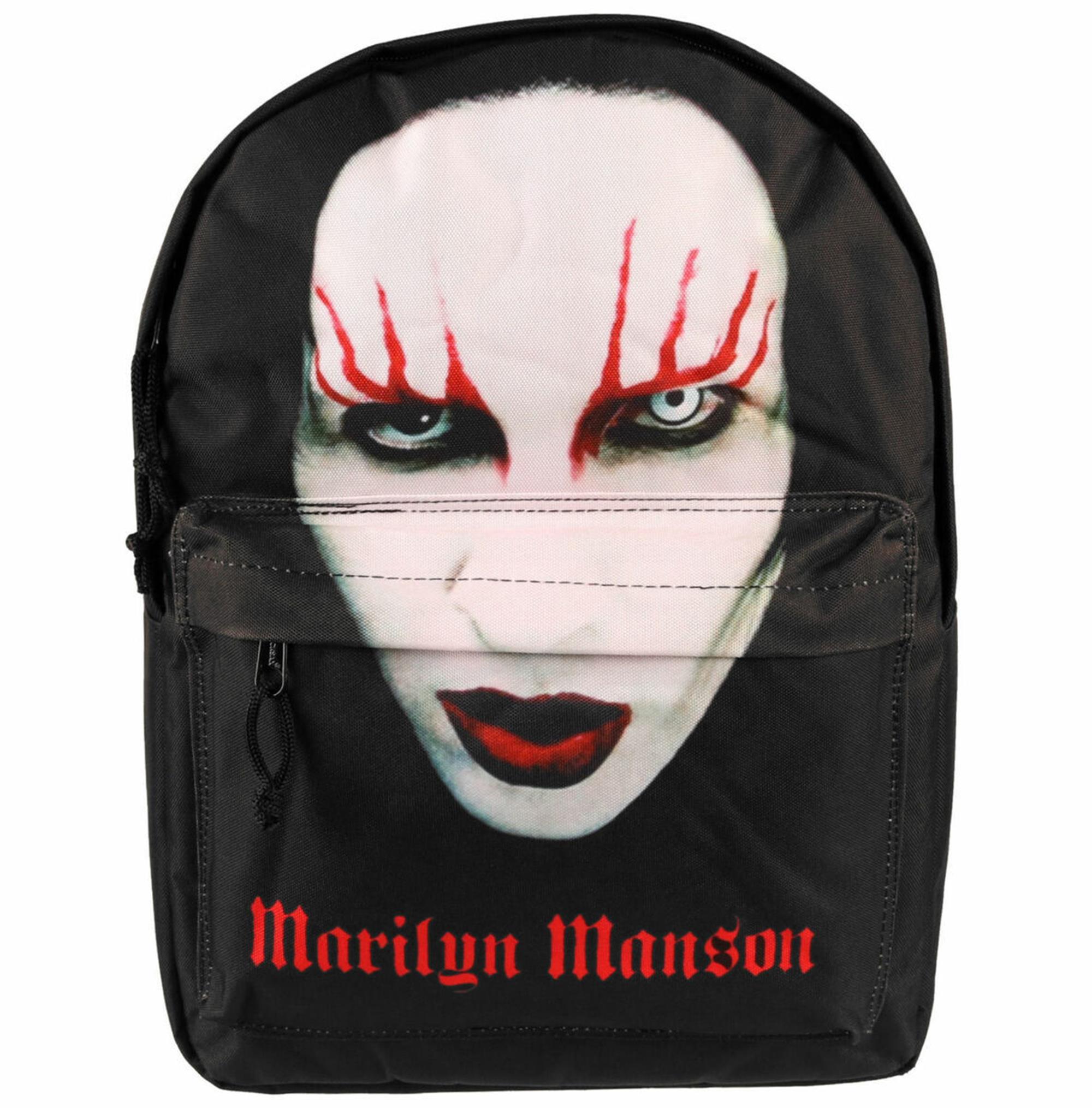 A backpack with an image of shock rocker Marilyn Manson with blood-stained lips and bleeding eyes. Crafted with resistant polyester fabric and lining. Spacious front pocket, an internal divider, an external media/headphones port, and adjustable padded straps.