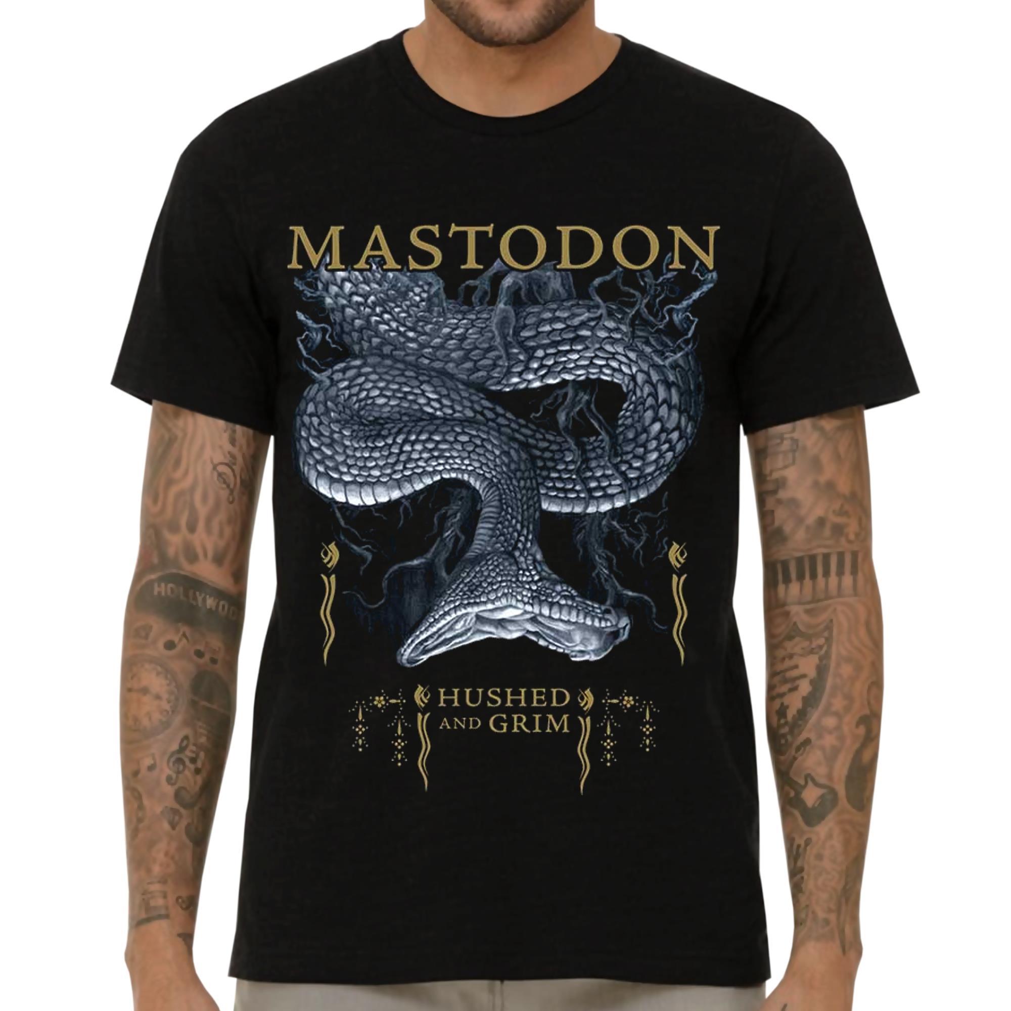 This awesome t-shirt features snake artwork inspired by the 2021 Mastodon album, Hushed and Grim.