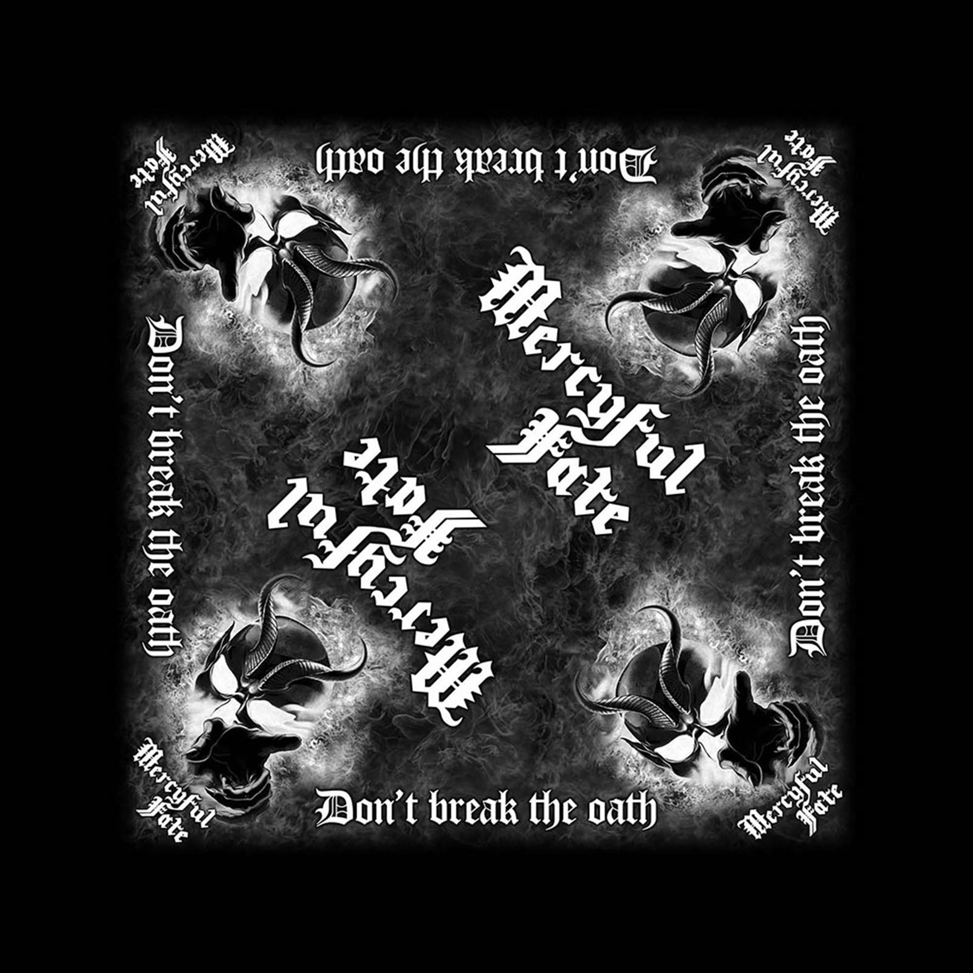 This black bandana features the satanic mascot from Mercyful Fate's 1984 album, Don't Break The Oath. The style Mercyful Fate employed on the album resembled a mixture of heavy metal with progressive elements.