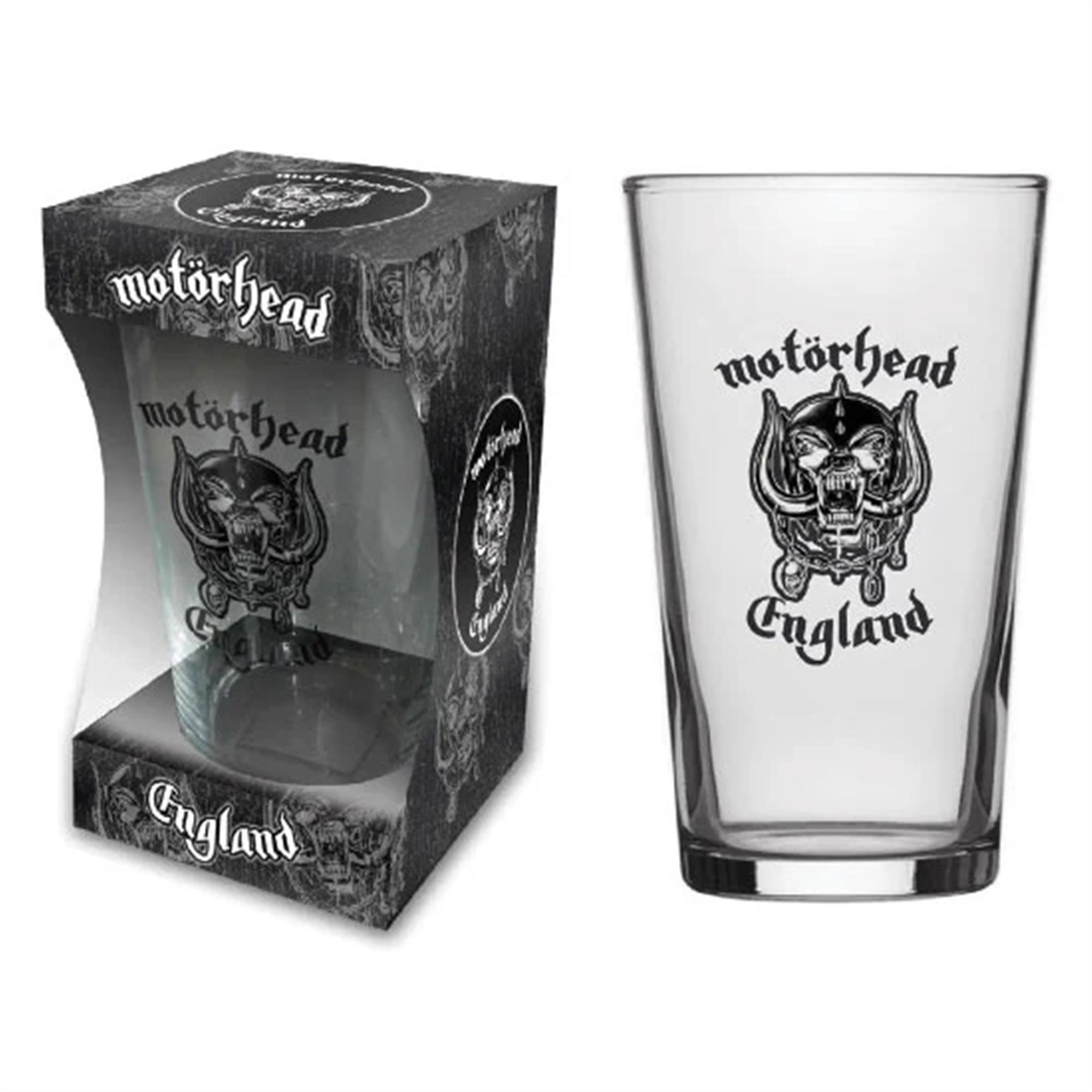 Pint glass featuring the bands' demonic mascot War-pig and an ode to England, Motorheads' homeland.