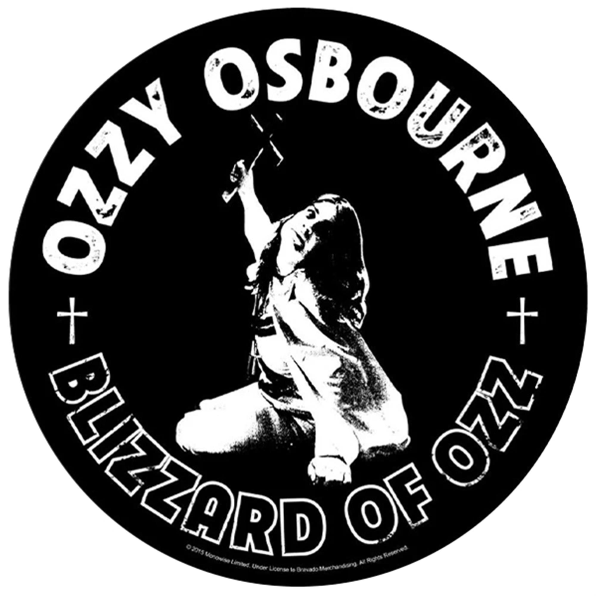 Circular patch featuring a black and white image of Ozzy with a cross in his hand, captured from the Blizzard of Ozz album cover, released in 1980.