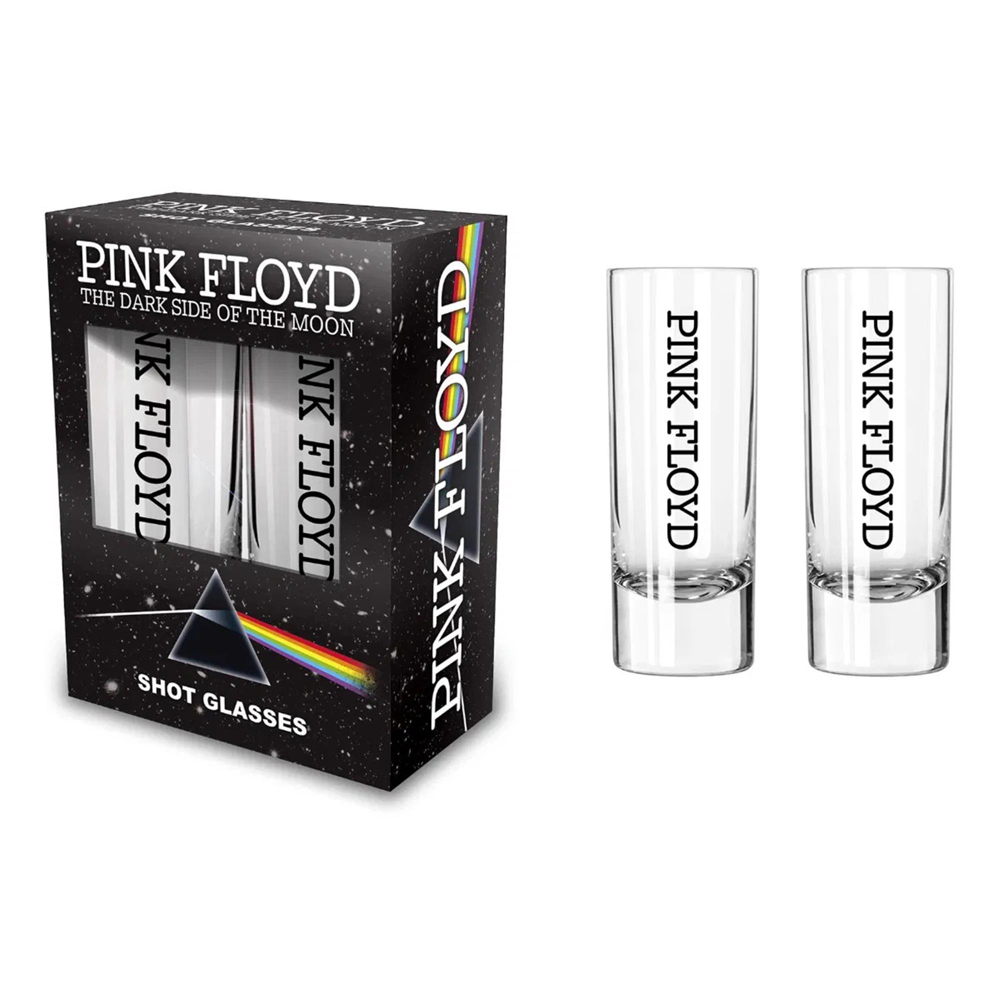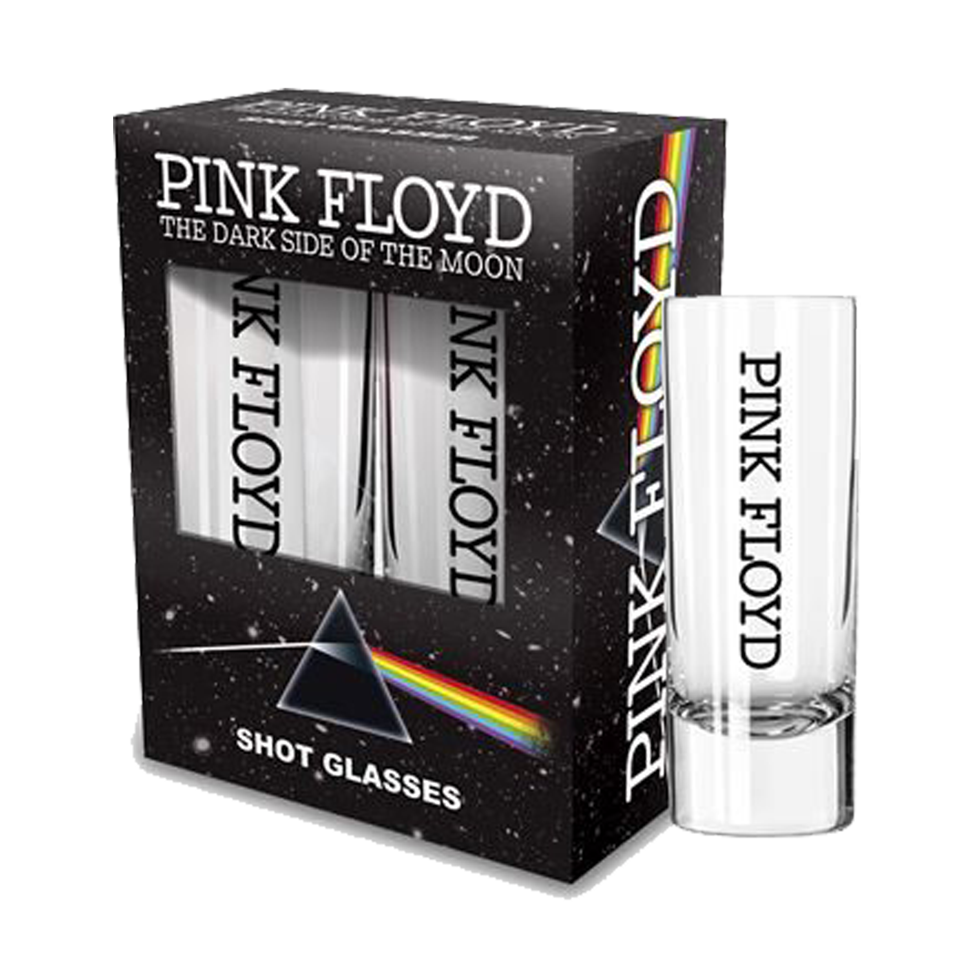 This set of shot glasses features the Pink Floyd band logo as seen on their ICONIC album cover, Dark Side of the Moon (1973).